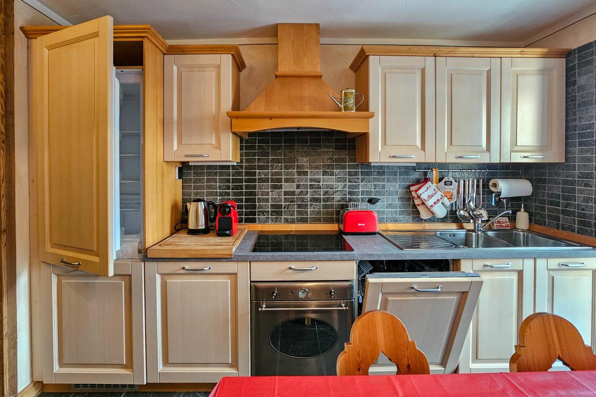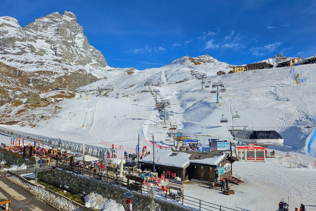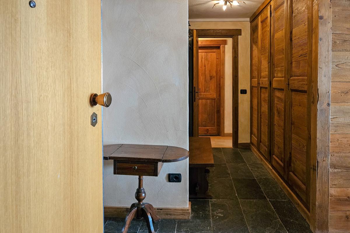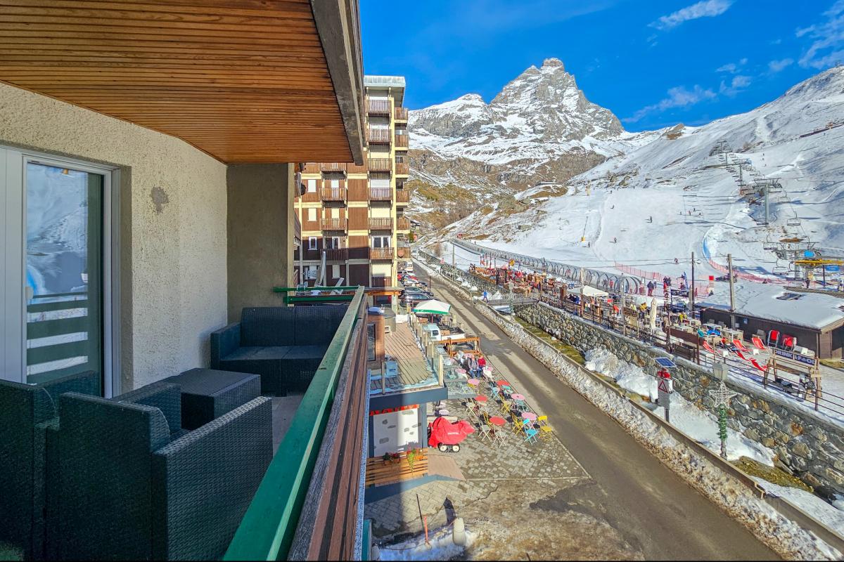 L’appartamento è composto da un pratico ingresso attrezzato, perfetto per riporre sci, scarponi e abbigliamento tecnico. Il luminoso soggiorno si apre su un terrazzino panoramico con splendida vista sul Cervino, ideale per momenti di relax dopo una giornata sulla neve.